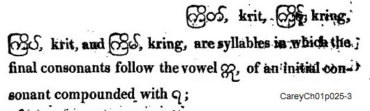 N.B. Previously to the first line of each table, the compound consonants [Carey does not differentiate medials and conjuncts] combined with the vowels are inserted, each of which may be followed by a final consonant, and forms a new table. (p023end-p024begin)