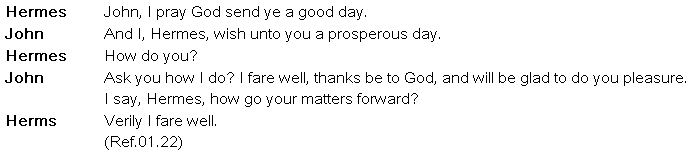 The Caxton manual follows the traditions of the older manières except that, unlike then, it is bilingual. It is severely practical in its aims and contains no linguistic information about either French or English. It opens with a set of customary greetings: 'Syre, god you kepe! ...I haue not seen you in longe tyme ...Syre, gramercy of your courtoys (courteous) wordes and of your good wyll', (Ref.01.14) and so on. It then moves on to very simple texts which are designed to introduce useful vocabulary for household equipment ('ketellis, pannes, basyns') (Ref.01.15), servants, family relationships, etc. A shopping dialogue follows with lists of words for meat, birds, fish, fruit, herbs, etc. and a very detailed dialogue on the buying and selling of textiles of various kinds, mainly wool but also hides, skins, and other materials.