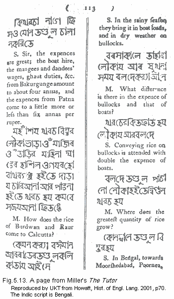 I should like to close this survey of the spread of English language teaching in the eighteenth century on a completely different note with a book that was not produced in Europe at all but in India. Published in Serampore in 1797 and printed by the author John Miller himself, The Tutor is possibly the earliest example of a book written to teach English in what would today be called the Third World. It is one of Alston's most fascinating discoveries, the only known copy being in the library of Calcutta University. [{See my note on teaching of foreign languages in Myanmar .}]