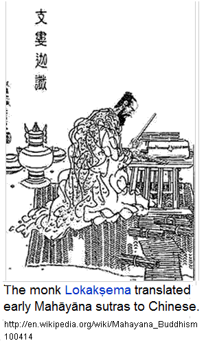 The earliest Mahāyāna sutras proper were the very first versions of the Perfection of Wisdom series and texts concerning Akṣobhya Buddha, which were probably composed in the first century BCE in the south of India.[21][32][33] Some slightly later early Mahāyāna sutras are the Chinese translations made by the Kushan monk Lokakṣema in the Chinese capital of Luoyang between 178 and 189 CE.[18] He translated the following sutras: Aṣṭasāhasrikā, Aksobhyatathagatasyavyuha, Śūraṅgama Samādhi Sūtra, an early version of a sutra connected to the Avataṃsaka Sūtra, Drumakinnararajapariprccha, Bhadrapalasutra, Ajatasatrukaukrtyavinodana and the Kasyapaparivarta,[34] which were probably composed in the north of India in the first century CE.[35] Thus scholars generally think that the earliest Mahāyāna sutras were mainly composed in the south of India, and later the activity of writing additional scriptures was continued in the north.[36]