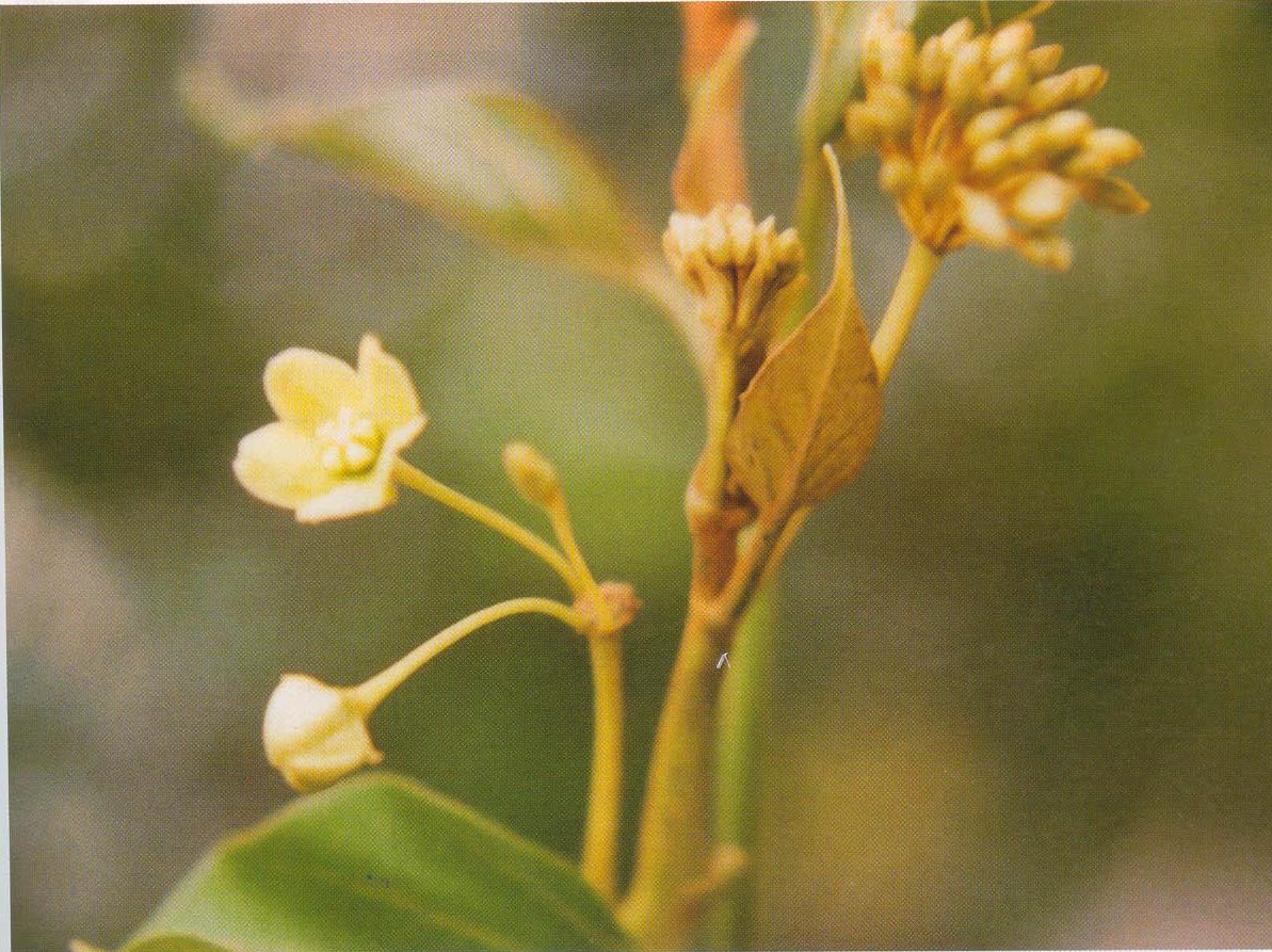 • A twining shrub; stems lianous, much branched, leafy, the younger ones tereted, hoary-puberulous, bark corky, sap milky. Leaves opposite, simple; stipules minute; petioles puberulous; laminae broadly ovate or ovate-oblong, the bases rounded or cuneate, the margins entire, the tips acute to retuse, unicostate, reticulate, the upper surfaces glabrous, the lower with hoary pubescence, coriaceous. Inflorescences umbellform cymes, axillary, the cymes solitary or in pairs, many-flowered; peduncles hoary-puberulous. Flowers ebracteate, ebracteolate, pedicellate, bisexual, actinomorphic, pentuncles hoary-puberulous. Calyx synsepalous, turbinate, shortly 5-lobed, the lobes obtuse. Corolla synpetalous, 5-lobed, rotate, the tube short, the lobes thick, ovate-oblong, the margins revolute, pubescent, greensih yellow; corona double, corolline corona of 5 quadrate truncate fleshy lobes at the sinuses, staminal corona minute, annular, close to the staminal column at the base of the anther dithecous, globose, wihtout terminal appendages, incumbent on the style top, pollen granular forming pollinia or pollen-masses, pollinia 1 in each cell, erect, the tips pellucid. Pistill 1, ovaries 2, each ovary 1-carpelled, 1-loculed, the ovules pendulous, imbricated in several series on a ventral and parietal placenta, the styles 2, the stigma 5-lobed. Fruit a follicetum of 2 follicles (one aborts), straight, turgid, smooth, beaked, woody; seeds narrowly ovoid, with a tufted micropylar coma of long silky hairs, endosperm thin and small. Flowering period: April-July. Fruiting period: August-September. -- KS-TMN