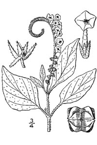 An annual herb, coarse, succulent; stems stout, cylindrical, with longitudinal grooves, branches ascending, densely hirsute. Leaves alternate or subopposite, simple; exstipulate; petioles obscurely winged; laminae ovate or ovate-oblong, the bases rounded, then narrowed and decurrent into the petiole, the margins crenulate, the tips subacute, unicostate, reticulate, the veins more conspicuous on the lower side, the upper surfaces puberulent, the lower villous. Inflorescences scorpioid cymes, spicate, terminal and unilateral on the peduncle, leaf apposed; bracts lanceolate, persistent. Flowers ebracteolate, sessile, bisexual, actinomorphic, pentamerous, hypogynous. Calyx synsepalous, 5-partite, the lobes linear-lanceolate. Corolla synpetalous, 5-lobed, infundibuliform, the tubes tubular, the lobes orbicular, spreading, imbricate or contorted in bud, naked at the throat, light mauve. Androecium polyandrous, stamens 5, epipetalous, inserted, the filaments very short, alternate with the corolla lobes, the anthers dithecous, ovoid, basifixed, introrse, dehiscence longitudinal. Pistil 1, ovary ovoid, 2-carpelled, syncarpous, 2-loculed, becoming 4-loculed at maturity due to false septation, the ovule 1 in each locule, the placentation axile, at times seemingly basal, the style 1, terminal, the stigma conoid-linear. Fruit a durpe, ovoid, 2-lobed, 4-ribbed, separating into two, 2-seeded, 2-pointed pyrenes; seeds 4, ovoid, endosperm abundant. Flowering period: April-June-October. Fruiting period: July-August-November -- KS-TMN