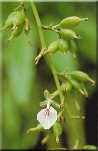 A perennial herb; rhizomes horizontal, tuberous, thick, fleshy, aromatic; aerial stems elongate, leafy; roots adventitious, arise from rhizomes. Leaves cauline, alternate, distichous; petioles short; ligules triangular; blades lanceolate to elliptical, the bases usually cuneate, sometimes obtuse, the margins entire, undulate, the tips acute to acuminate, venation closely parallel-pinnate, the upper surfaces glabrous, the lower pubescent. Inflorescences terminal paniculate cymes; bracts small, ovate, scarious. Flowers pedicellate, bisexual, zygomorphic, trimerous, epigynous. Calyx synsepalous, 3-lobed, the lobes minute, triangular, the tubes tubular, short. Corolla synpetalous, 3-lobed, the tubes cylindrical, the lobes equal, elliptic-oblong, cucullate, the upper lobe broaderthan the laterals, greenish white. Androecium polyandrous, the fertile stamen 1, stout arcuate, the filament flattened, epipetalous at mouth of corolla tube, yellow above, reddish below, the anthers dithecous, the lobes ellipsoid, divergent apically, yellow the spur and crest absent, the lateral staminodes absent, the lip or labellum orbicular, retuse, the margins incurved, cream coloured, with red streaks on either side, the 2 basal auricles small, tooth-like, basifixed, introrse, dehiscence longitudinal. Pistil 1, ovary globose, 3-lobed, 3-carpelled, syncarpous, 3-loculed, the ovules numerous, the placentation axile with one row of ovules in each locule, the style filiform, inserted within the grooved filament of the fertile stamen, the stigma infundibuliform. Fruit a loculicidal capsule, globose; seeds numerous, small, angled, arillate, aromatic, endospermc. Flowering period: October-December, Fruiting period: January-March -- KS-TMN