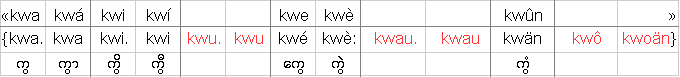The vowels that these {wa.hsw:}-medials, illustrated by {kwa.}-medials, cannot pick up are /u/, /o/ and /ɒ/ represented by Burmese-Myanmar vowels{U} /u/,