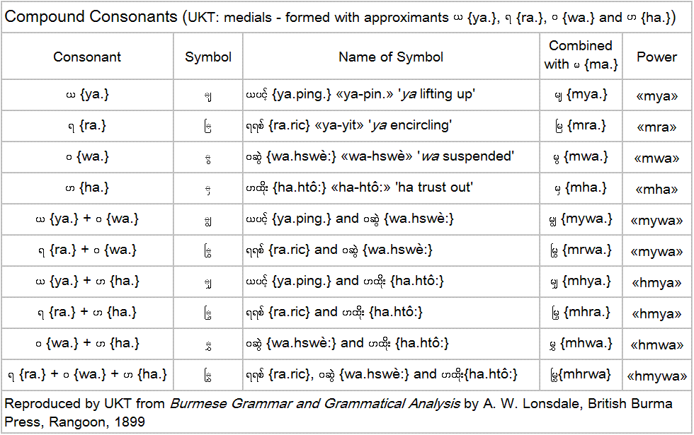 The "compound consonants" Lonsdale is referring to are the medials formed with the consonant{wa.} (same as English <w>) (refer to the IPA and English consonant tables in ch02.htm, in which