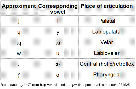 In articulation and often diachronically, palatal approximants correspond to front vowels, velar approximants to back vowels, and labialized approximants to rounded vowels. In American English, the rhotic approximant corresponds to the rhotic vowel.