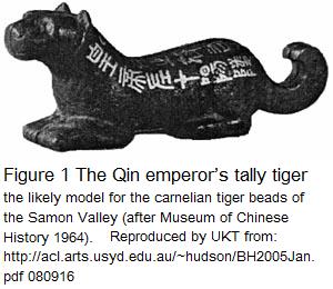 Dozens of carnelian pendants carved like a tiger have been found in Myanmar, mainly in the Samon Valley. On the basis of the effort taken to carve them, they seem to have been important and probably expensive items. There is a remarkably close morphological relationship between the Myanmar carnelian tigers (Glover & Bellwood 2004, Plates 3 & 5) and bronze Qin Dynasty (221-207 BC) “Tally Tigers” of China (Figure 1), which were symbols of military office (Museum of Chinese History, Guidebook to the Exhibits 1964; Cheng & Cheng 1993: 193; Gengwu 2001: 64). Assuming that the Chinese model was the original, the Samon region from c.200 BC onward is the likeliest source of carnelian tiger beads.