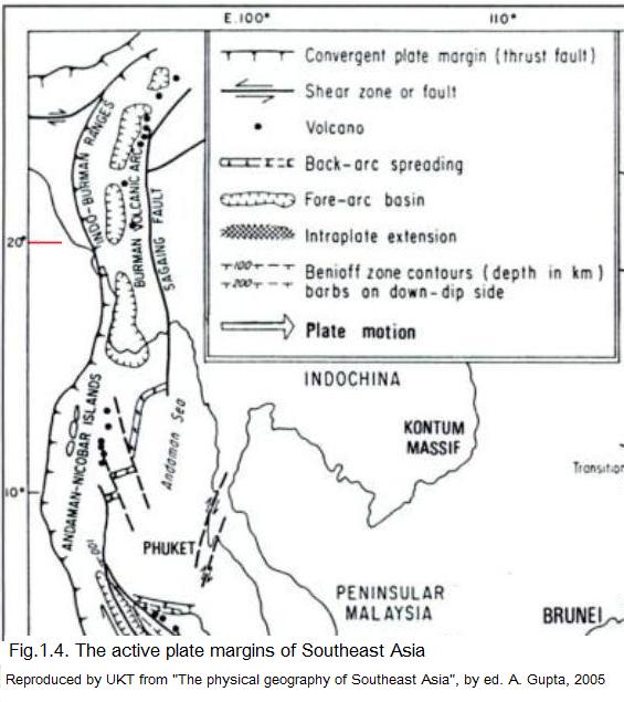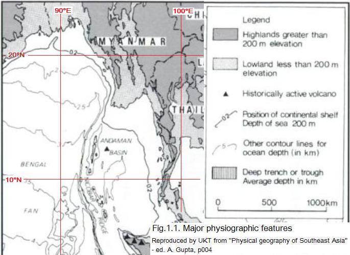 The Eurasian continental plate protrudes as a peninsular extension (Sundaland) southwards as far as Singapore, continuing beneath the shallow Straits of Malaca and the Sunda Shelf as the island of Sumatra and the northwestern part of Borneo (Figure 1.1 - UKT: I have taken the part related to Myanmar, the reader is adviced to consult the original map.)