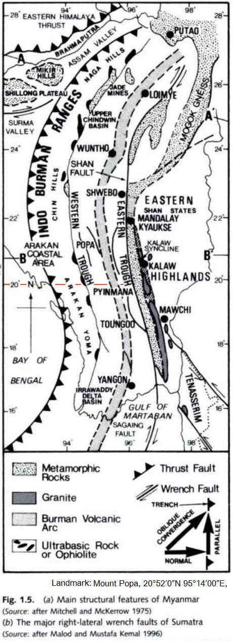 The volcanic rocks lie on three distinct lines (Chhibber 1934; Stephenson and Marshall 1984). The Western Line, through Narcondam and Barren Islands is tholeitic and still active. The Central Line, through Mount Popa [UKT: Mount Popa, 20°52'N 95°14'E, is the most prominent landmark], is calc-alkaline and high-K calc-alkaline and extinct in the Pleistoncene. The volcanoes of this line are subduction-related and the Benioff zone was easterly dipping. An Eastern Line, through Thaton and Madaw Island, is alkaline and probably related to continental rifting in the back-arc area related to the Sagaing-Namyin Fault system. A broad zone of earthquakes, wedge-shaped in east-west cross-section, extends eastwards from the western margin of the Indo-Burman Ranges, but there is no longer any well-defined Benioff zone. A formerly eastwardly dipping is inferred because the earthquakes become deeper eastwards.