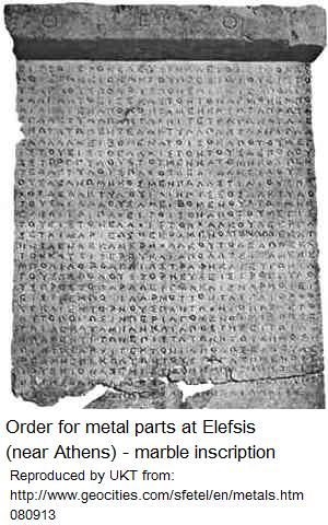 UKT: Do I think the "order for metal parts" inscription (from: http://www.geocities.com/sfetel/en/metals.htm 080913) on the right to be genuine and not a hoax? I reserve my judgment until I come across other supporting evidence. It seems strange that such a simple order had to be on a marble slab. However, it could just be an ad set up in front of a metal works in ancient Greece.