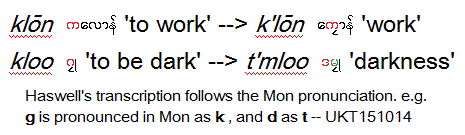 Though the same akshara is used, the pronunciations are radically different.UKT 151013: I will be using the abbreviation ipa - "is pronounced as" - to show the pronunciation whenever necessary. Take note that Haswell's transcription reflects the Mon-Myan pronunciation of consonants, e.g.
