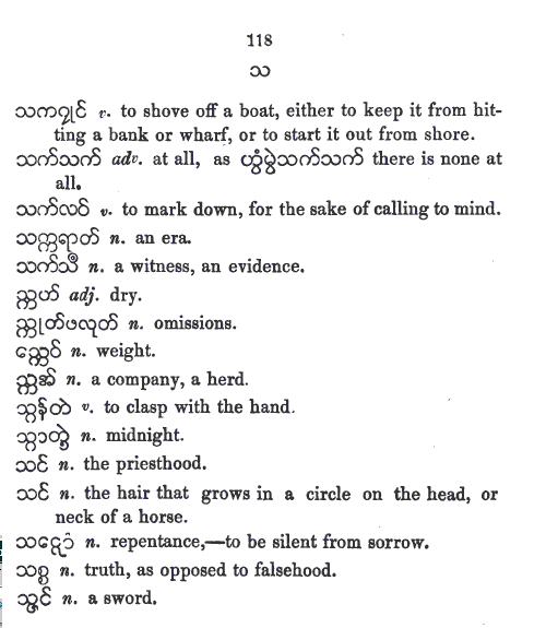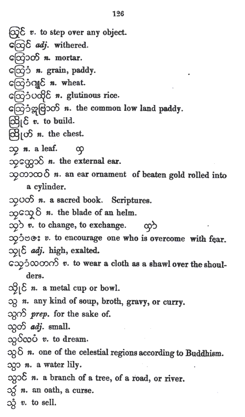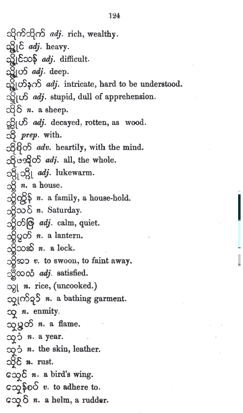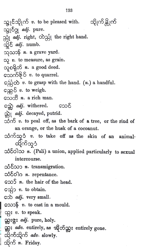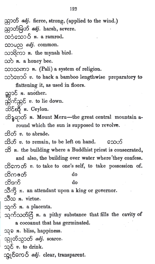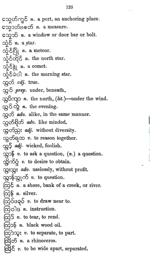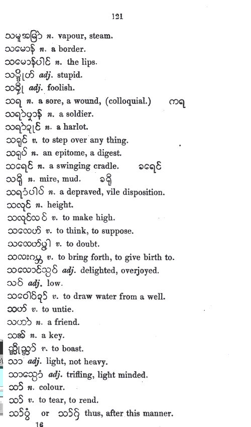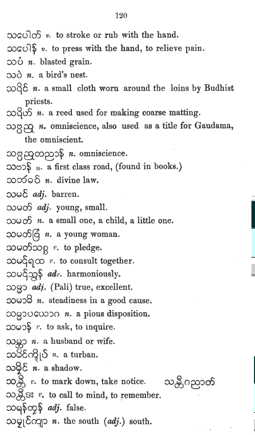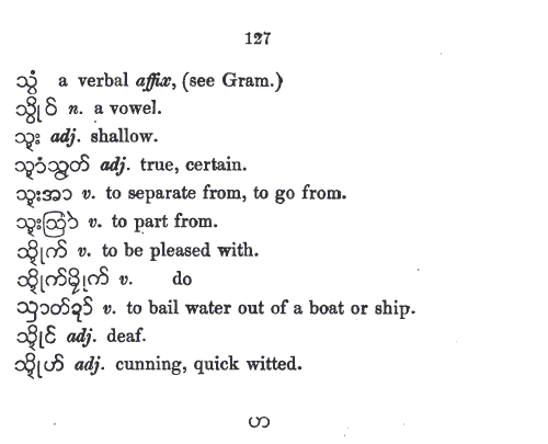 UKT 140605: Mon-Myan is the first Austro-Asiatic language I am studying. I have expected its phonology and its vowel-system to be different from those of Bur-Myan - the Tibeto-Burman language. The present entry, the r6c5 member, a non-hissing thibilant in Bur-Myan. However, it is pronounced as a hisser in Mon-Myan, even though the same glyph is used. Whether it is the same as Skt-Dev स «sa» is yet to be decided after a study of Skt-Dev, an Indo-European language. I cannot rely on the works of others because, so far none has based his or her work solely on phonological approach. Bur-Myan is devoid of inflexions as pointed out by A. W. Lonsdale in his Burmese Grammar and Grammatical Analysis 1899 , Rangoon: British Burma Press, 1899 - BG1899-indx.htm (link chk 140605). In this respect Bur-Myan differs from Pal-Myan. Bur-Myan has no tenses, and no numbers. Not having finished looking into Lonsdale's work, my view on Mon-Myan is only tentative. My study of Haswell and Stevens Mon-Myan vocabulary is pointing out that Mon-Myan might also be devoid of inflexions, tenses, and numbers. I still need to study more.