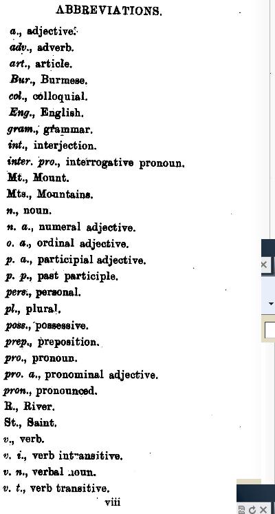 This fact is indicated here and there upon the following pages by the abbreviation "Bur". That however does not necessarily denote that the term to which it is attached, was derived from the Burmese. [UKT ¶]