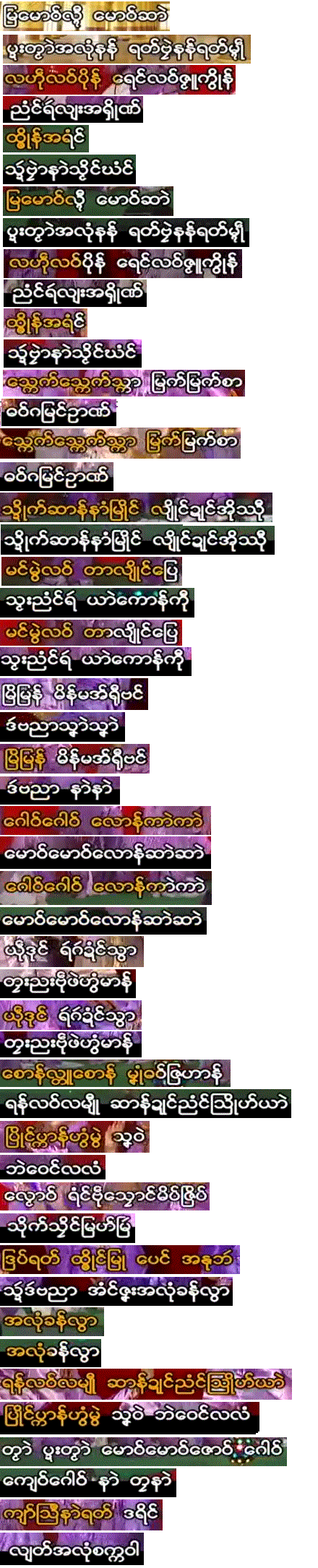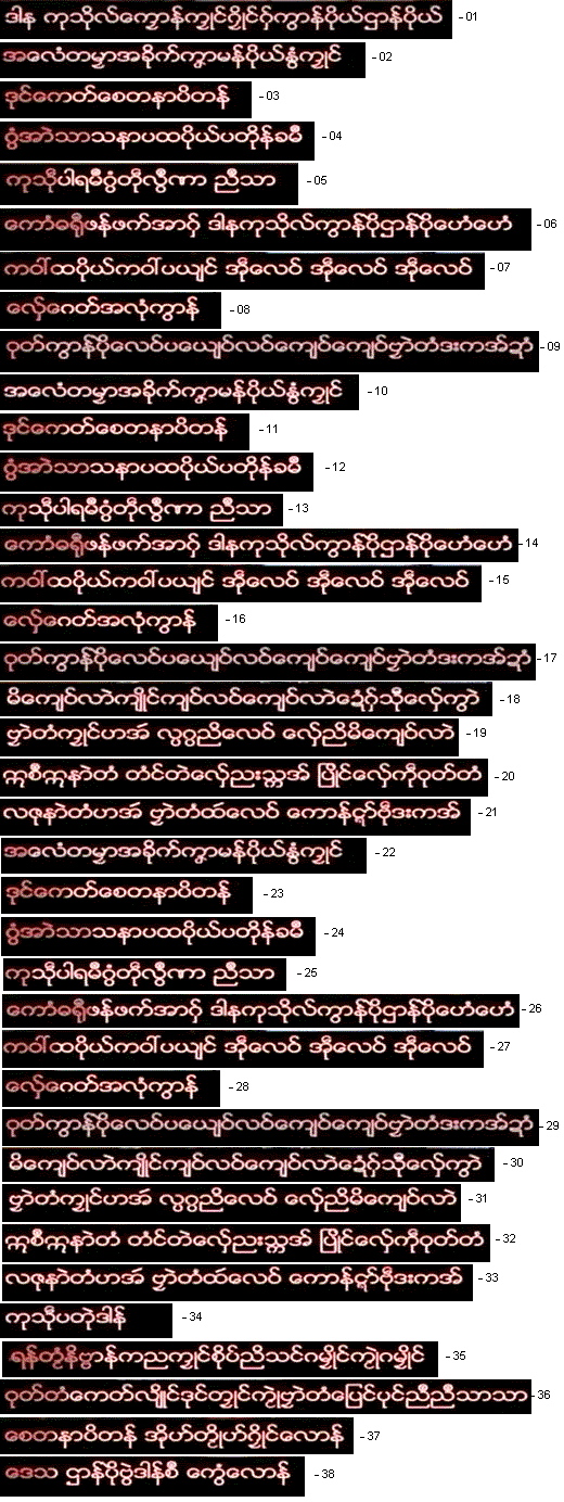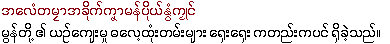 Please remember that none of us at the TIL Research Station at #35 Thantadalan, Sanchaung, Yangon, including myself do not know Mon-Myan, and my able assistant Daw Khin Wutyi might have missed certain lines in downloading the lyrics from the video.