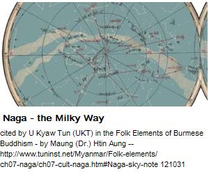 The Naga in the sky is actually the Milky Way as seen in the night sky. See insert -- the head of the Naga is on the right side of the insert while the tail is on the left. The Pole Star is in the centre. From: Map of Union of Myanmar and the World (in Burmese), by Dr. Daw Thin Kyi, et.al., {tha.ma-meit~ta.}, 1956, p.5. See a full account of the Breath of Naga in Nakshatra in the Sky (in Burmese), by U Tézaniya et.al, B.E.T. Press, Yangon, 1967