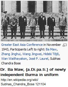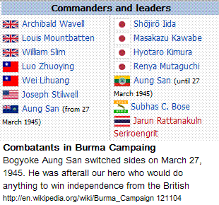 UKT: The Burma Campaign in World War II is now largely told as a one-sided story. The fighting was between the Allied Powers (led by American and British), and the Axis powers (principally in the East by Imperial Japan). The Imperial Japanese Army was aided by BDA 'Burma Independence Army' under Bogyoke Aung San of the newly Independent Burma (recognized by the Axis powers and which had declared war on the Allied powers), and INA 'India National Army' under Subhas Chandra Bose. http://en.wikipedia.org/wiki/Subhas_Chandra_Bose 121104