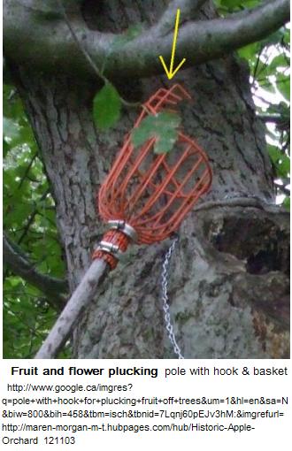 a hook, a pole with a hook, used (1) for plucking fruit off trees,