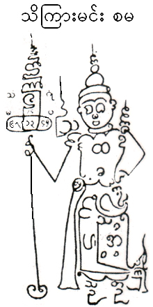 {ín:} conveys an idea, or a message and it must be written or scratched into a broken part of consecrated alms bowl, a gold or leaf, a palm leaf, or paper, by an adapt who has meditated for a least a night or for a period of 7 days, abstaining from eating meat and having sex. The writing must be according a fixed procedure or Tantra while reciting a Mantra. The whole procedure must be done under a suitable combination of constellation in the sky above. The resulting Yantra is supposed to possess the message. The Yantra becomes the embodiment of an unseen entity, a benefic god or goddess, or a malefic entity such the soul of a tiger, a cat, a witch. A Yantra is not a play thing, and a person holding the Yantra can command it to perform deeds capable by the embodied entity. The Yantra shown on the right is the Sakka, King of Heaven. It was constructed on paper by an adapt, one each day for 49 days. The paper, 4 in. x 2 in., was burnt and the ashes dissolved in water was swallowed by the adapt to give himself the power of the Sakka. Now, his orders (or the orders of Sakka) had to be followed by witches and ogres, and must leave the patient being affect by them. The adapt can now earn his meagre living as an exorcist curing patients, mostly of insanity and other diseases which cannot be cured by modern medicine.