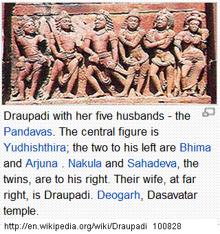 UKT: Draupadi literally means 'the daughter of Drupada'. She was the common wife of all five Pandava brothers giving rise to my observation that the Ancient Indian society was not only very open but very tolerant where both bigamy and polyandry were accepted. - UKT110829
