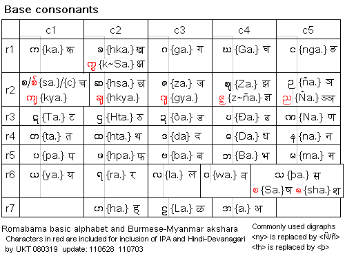 represents the r2c1 consonant in the Bur-Myan akshara matrix. Though it has the