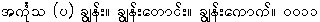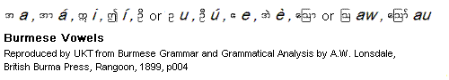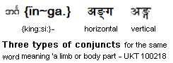 {king:si:} orthography for the first time. I am wondering why the old Bur-Myan grammarians had chosen to put the {nga. þût} on top of the following grapheme. Was it because these ancients of Old Pagan (or more properly of Tagaung) - the contemporaries of the Gupta period in India had noticed that this sound corresponding to the Devanagri-{nga.} was missing in Indian speeches, but present in Burmese. This conjecture of mine may be dismissed as just a day-dream. I am basing my argument on the fact that the Devanagari grapheme for /ŋ/ ङ , had to be borrowed from /ɖ/ ड and a dot added. Please note that I am in need of help from a phonetician. -- UKT110924