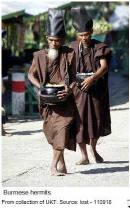 UKT: My interest in Aranyaka monks of Myanmar is because of they have been identified with the Arigyi monks of the Pagan who King Anawrahta had uprooted in the 11th century AD. However, Dr. Than Tun, Journal of Burma Research Soc. (JBRS), XLII, ii, Dec 1959, infers that these Aranyaka monks may not be the ancient Arigyi who had gone underground only to resurface in later periods. The pix on the right shows Burmese hermits - not monks. See my note on Aranyaka monks .