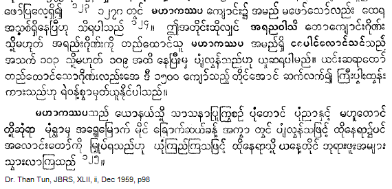 Excerpts from Dr. Than Tun, Journal of Burma Research Soc. (JBRS), XLII, ii, Dec 1959 (in Bur-Myan), and my remarks based on the quoted text immediately below.