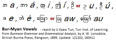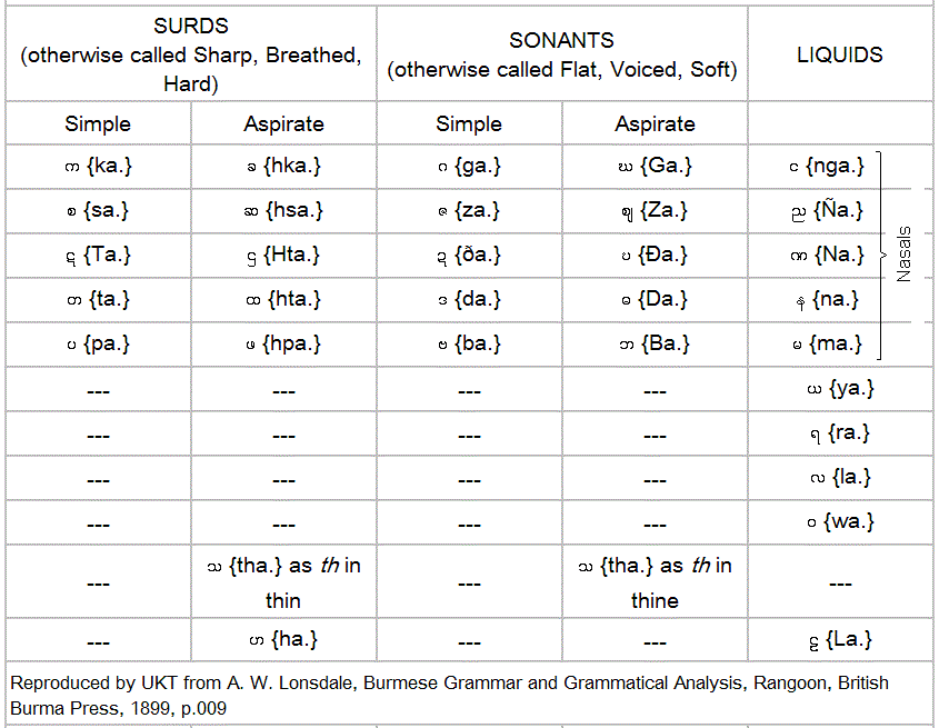 {a·ré:} especially in non-phonetic languages such as English. However in phonetic languages like Bur-Myan, where there is almost one-to-one correspondence, there is no difference between sound and script. However, for convenience sake, we'll adopt Lonsdale term "letter" in this work. There are also differences between Lonsdale and TIL, e.g. :