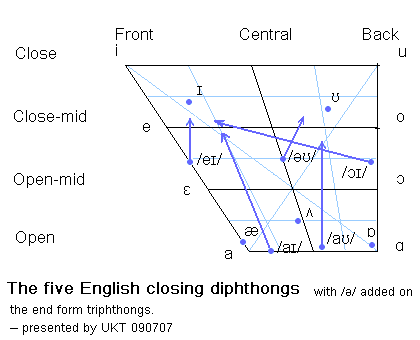 The closing diphthongs have the characteristic that they all and with a glide towards a closer vowel. Because the second part of the diphthong is weak, they often do not reach a position that could be called close. The important thing is that a glide from a relatively more open towards a relatively more close vowel is produced.