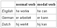 This table lists some modal verbs with common roots in English, German and Dutch.