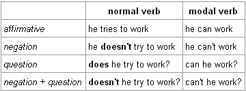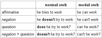 In English, main verbs require the auxiliary verb do to form negations or questions. Modal verbs never use this auxiliary do :
