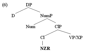 Two other intermediate possibilities are also anticipated to be available and exist, first, the use of a classifier as a nominalizing element combining with a non-nominal complement, as in (6), and second, the use of a numeral as a nominalizer, as in (7). In both instances the structures produced are expected to have some, but not necessarily all typical properties of nominal projections. For example, if adjectival modification is assumed to occur via the adjunction of an adjectival phrase/AdjP to a noun-phrase/NP, the absence of an NP in structures (6) and (7) may be expected to correspond to a lack of adjectival modification with such nominalizations.