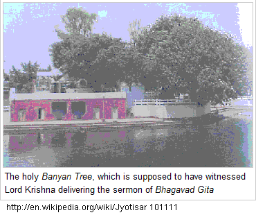 A marble chariot depicting Lord Krishna delivering the sermon to Arjuna marks the site of the Srimad Bhagwad Gita. In one secluded section of this center, an old Shiva temple can also be seen. Hundreds of years ago, a holy water tank was present here and it can still be seen in the rainy season. The Kurukshetra Development Board has renovated the site in recent times. A mango shaped lake has been constructed here with covered bathing ghats for ladies. Cement parapets and enclosures have been built for protection. A light and music show is organized by the tourism department at the site, on a regular basis, which recreates episodes from Mahabharta. A restaurant and accommodation wing for Yatrees have been built and the entire area has been landscaped with flowering bushes and eucalyptus trees.