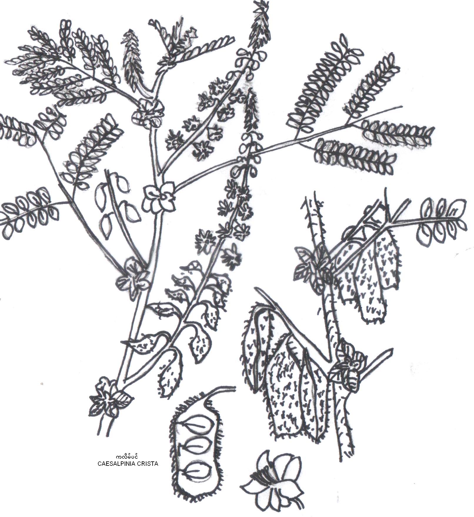 It is a large, scandent, prickly shrub or climber. The bark is dark brown with numerous recurved prickles. The branchlets are glossy, occasionally lenticellate, armed with 4-5 mm long recurved prickles. Leaves pinnate with prickles. The pinnae are 8-13 pairs, leaflets are 9-12 pairs per pinna, which are membranous and oblique to truncate. The flowers are small, yellowish with a red dot at the base or red veined, in axiliary and terminal racemes. The pods are short beaked, 1-4 seeded and often constricted. The seeds are dark brown, sub-globose and hard. -- www.himalayahealthcare.com/herbfinder/h_caesalpina.htm