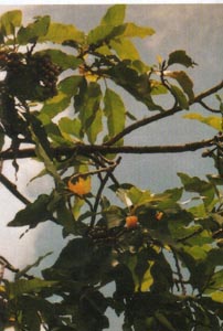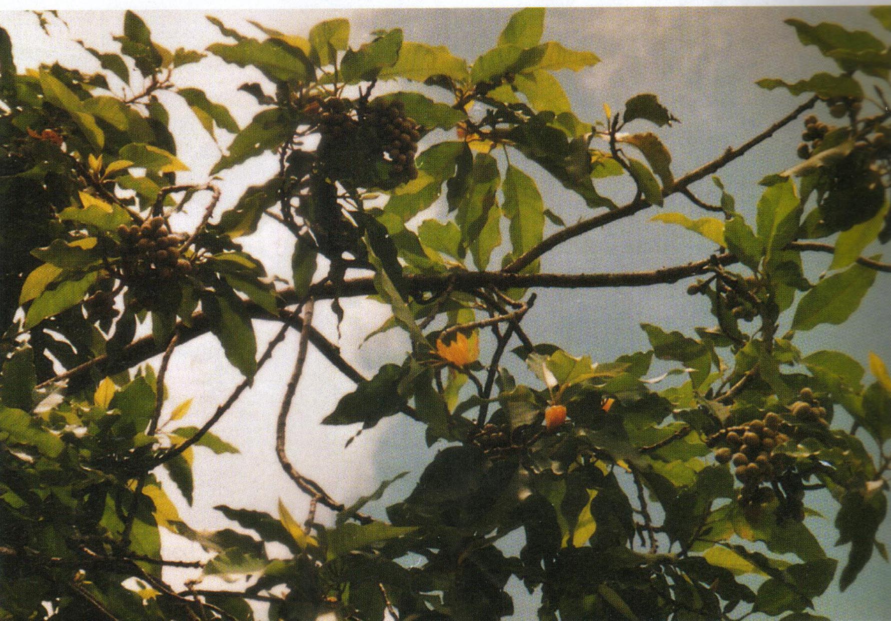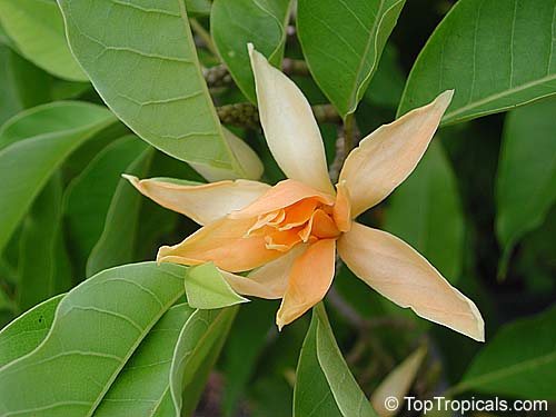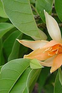 • An evergreen tree, tall with a straight trunk; branches spreading, dense, the younger stems pubescent. Leaves alternate, simple; stipules convolute, deciduous; petioles short; laminae ovate-lanceolate, the bases obtuse to rounded, the margins entire, the tips acute, unicostate, reticulate, the upper surfaces glabrous, glaucous, the lower glabrescent. Inflorescences in solitary cymes, axillary; bracts spathaceous, coriaceous, pubescent, greyish yellow, enclosing the floral bud, deciduous. Flowers ebracteolate, pedicellate, bisexual, actinomorphic, polymerous, hypogynous. Calyx and corolla undifferentiated, perianth segments 15, apophyllous, arranged in whorls of 3, pale yellow or orange, very fragrant; sepals or the outer whorl oblong, acute; petals or the inner 4 whorls linear. Androecium polyandrous, stamens numerous, spirally disposed on basal portion of the androphore, the filaments short, the anthers dithecous, linear, adnate, dehiscence longitudinal. Pistils many, spirally arranged on an style short, stigmatose on the inner surface. Flowering period: June - August.Fruiting period: September - November -- KS-TMN