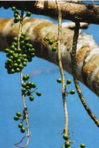 A climbing shrub with corky bark, leaves 2-4 in. diam., acute or acuminate, racemes exceeding the leaves, axillary or terminal or on the old wood, flowers yellow, males fascicled, female usually solitary, glabrous, drupes size of a pea, red. -- UHM