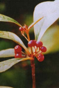 • A shrub; younger stems cylindrical, glabrous. Leaves alternate, simple; exstipulate; petioles short, stout; laminae elliptic or obovate-elliptic, the bases cuneate or obtuse, the margins entire, the tips shortly acuminate, unicostate, reticulate, the surfaces glabrous, coriaceous. Inflorescences in axillary corymbose cymes; bracts deciduoud. Flowers ebracteolate, pedicellate, bisexual, actinomorphic, pentamerous, hypogynous. Calyx synsepalous, 5-sect, campanulate, the lobes elliptic, petaloid, pinkish, persistent and accrescent and closely pressed to fruit. Corolla synpetalous, 5-partite, twisted to the right in bud, the tubes short, the lobes acute, pink. Androecium polyandrous, stamens 5, epipetalous, opposite the corolla lobes, the filaments very short, inserted, the anthers dithecous, ovoid-lanceolate, basifixed, introrse, dehiscence longitudinal. Pistil 1, ovary ovoid, 5-carpelled, syncarpous, 1-loculed, placentation free central, the ovules 10 in the locule, the style 1, stout, the stigma simple. Fruit a drupe, globose with peristent style, obscurely depressed, exocarp fleshy, endocarp stony, bright scarlet; seed 1, globose, endosperm copious. Flowering period: August-September. Fruiting period: October-January. -- KS-TMN