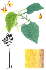 • Key characteristics: Medium sized tree; thin gray bark; heart shaped, entire, opposite leaves, 10–20 cm long and 7–13 cm wide with waxy bloom below; trumpet shaped yellow to brown flowers. Description: A medium sized tree up to 40 m tall and 140 cm in diameter, but usually smaller than this. Bark is thin and grey. Leaves are opposite, more or less heart-shaped, 10–25 cm × 5–18 cm, smooth or velvety beneath. The yellow or brown flowers are arranged in panicled cymes, 15–30 cm long, and appears after leaf-fall. The trumpet-shaped flowers are 4 cm long, nodding, hairy and short stalked. The fruits are ovate or pyriform, 2–2.5 cm long and contain 1–4 seeds. -- FAO