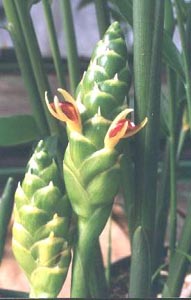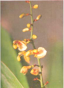A perennial herb; rhizomes horizontal, tuberous, thick, fleshy, aromatic; aerial stems elongate, leafy; roots adventitious, arise from rhizomes. Leaves cauline, alternate, distichous; petioles short; ligules triangular; blades lanceolate to elliptical, the bases usually cuneate, sometimes obtuse, the margins entire, undulate, the tips acute to acuminate, venation closely parallel-pinnate, the upper surfaces glabrous, the lower pubescent. Inflorescences terminal paniculate cymes; bracts small, ovate, scarious. Flowers pedicellate, bisexual, zygomorphic, trimerous, epigynous. Calyx synsepalous, 3-lobed, the lobes minute, triangular, the tubes tubular, short. Corolla synpetalous, 3-lobed, the tubes cylindrical, the lobes equal, elliptic-oblong, cucullate, the upper lobe broaderthan the laterals, greenish white. Androecium polyandrous, the fertile stamen 1, stout arcuate, the filament flattened, epipetalous at mouth of corolla tube, yellow above, reddish below, the anthers dithecous, the lobes ellipsoid, divergent apically, yellow the spur and crest absent, the lateral staminodes absent, the lip or labellum orbicular, retuse, the margins incurved, cream coloured, with red streaks on either side, the 2 basal auricles small, tooth-like, basifixed, introrse, dehiscence longitudinal. Pistil 1, ovary globose, 3-lobed, 3-carpelled, syncarpous, 3-loculed, the ovules numerous, the placentation axile with one row of ovules in each locule, the style filiform, inserted within the grooved filament of the fertile stamen, the stigma infundibuliform. Fruit a loculicidal capsule, globose; seeds numerous, small, angled, arillate, aromatic, endospermc. Flowering period: October-December, Fruiting period: January-March -- KS-TMN