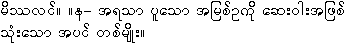 UKT: Notice how Nagathein and L่-seik-shin have spelled the Burmese-Myanmar name. In Nagathein and L่-seik-shin, there is the aspirate {ha.} modifying {ัa.}. Since, r2c5 {ัa} is a nasal consonant, adding the aspirate {ha.}, makes the pronunciation of the syllable very difficult for non-native Burmese-Myanmar speakers, and should be avoided wherever possible.
