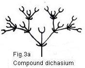 In its simplest form the primitive dichasium consisted of three flowers disposed in a cluster formed on a single peduncle by a dichotomous branching immediately beneath a terminal flower (Fig. 3a). From this