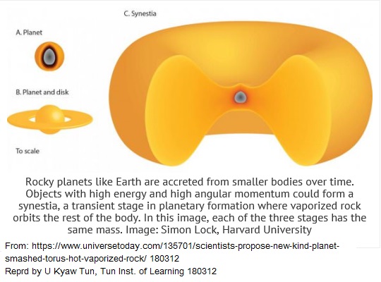 The standard model for the formation of the Solar System (including the Earth) is the solar nebula hypothesis. [23] In this model, the Solar System formed from a large, rotating cloud of interstellar dust and gas called the solar nebula. [UKT ¶]