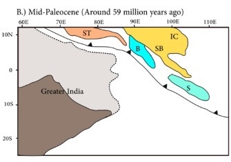 In early Eocene, the start of a hard continent-to-continent collision between India and the Eurasia Plate led to the formation of the Himalayan Orogeny. [33] On the eastern margin of the India plate, high oblique subduction occurs between the boundary of India and the Burma-micro plate. [34]