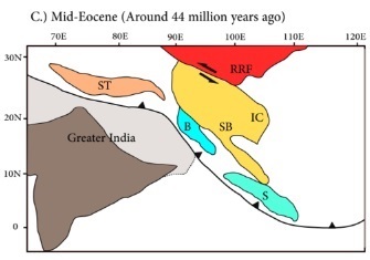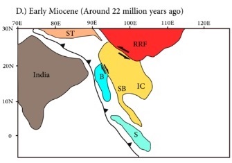 Between late Eocene to Miocene, the Burma and Shan-Thai block rotated 30° to 40° clockwise, to accommodate the major collision along the plate boundary. [33] This resulted in the trend of arc shifting from east-west to the north-south direction.