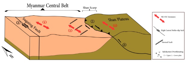 In the late Miocene (10ma), the Myanmar Central Belt underwent a major regional plate kinematic reorganization transition. [17] The tectonic regimes transform from northwest-southeast extensional force to basin inversion and was followed by a major uplift event caused by east-west compression during Plio-Pleistocene period. [36]
