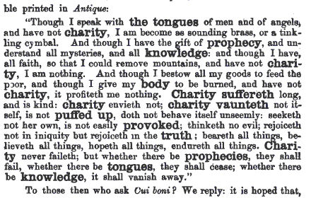 On opening the Bible at random, there were counted in the first paragraph read, I Cor. 18: 1-8, nineteen Pali words in eight verses. Some of these are repetitions, but there are ten different words. To exhibit this to the eye, the passage is here reprinted in English with the words that are, whole or in part, Pali in the Burmese Bible printed in Antique :