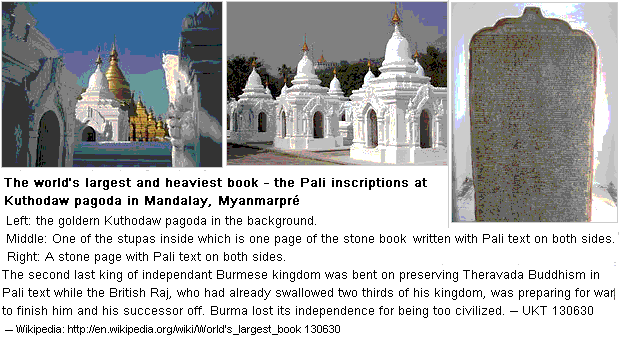 It can scarcely be said there is no Pali literature in the face of the king of Burmah's Pali Bible at Mandalay, written on both sides of 729 marble slabs, containing, it is said, 131,220 lines and 15,090,300 letters. [UKT ¶]