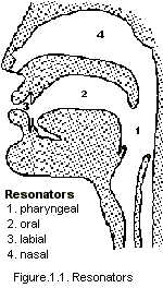 0101.Sound ProductionMost sounds in speech are produced by passing a stream of air from the lungs through one or more resonators belonging to the phonetic apparatus. The principal resonators are (Figure 1.1. Resonators): UKT: UNIL gave two figures, Figure 1.1 and Figure 4.1, which are the same. |