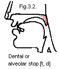 | [ t ] | U0074 Voiceless dental or alveolar stop. The tongue makes contact with the front teeth or with the alveolar ridge (UKT: Place and manner of articulation) directly above them. Fig.3.2. There exists a corresponding lax articulation in voiceless dental spirant [ θ ] that is one of the spirants. (UNIL) |