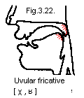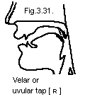 | [ ʀ ] | U0280 Velar or uvular tap. Here the body of the tongue serves as the site of vibration: the soft palate or uvula vibrates briefly against it. Fig.3.31 below). (UNIL) |